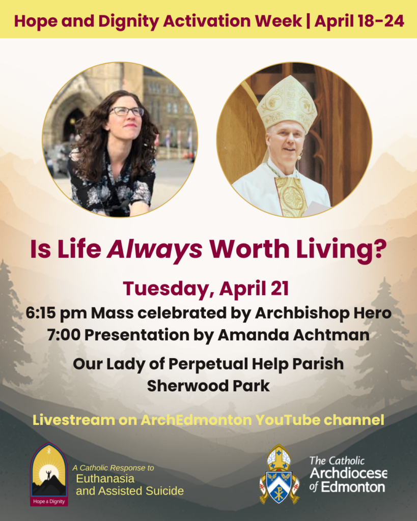 During Hope and Dignity Activation Week, Amanda Achtman will lead efforts to equip the faithful to prevent euthanasia and encourage hope, especially in the most vulnerable among us. Activation Week will include public presentations and targeted training for clergy, chaplains, pastoral staff, educators, and more. Archbishop Stephen Hero will celebrate Mass and provide remarks at a public event on Tuesday, April 21 at Our Lady of Perpetual Help Parish in Sherwood Park, calling Catholics to renew our commitment to human dignity and the sacredness of life.