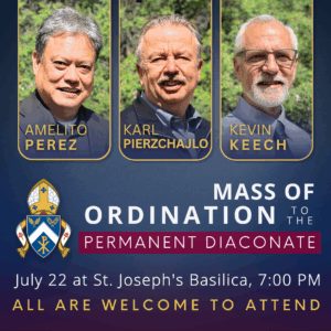 Amelito \’Ali\’ Perez is one of three men to be ordained to the permanent diaconate on July 22 at St. Joseph’s Basilica. Bishop Paul Terrio, retired bishop of the Diocese of St. Paul, will be the principal celebrant. Ali will be assigned to his home parish, St. Augustine in Ponoka, where he and his family have been active members since 1996. There are currently 36 permanent deacons serving in the Edmonton Archdiocese.