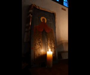 Present at the Vigil For Ukraine was an icon of our Mother Mary which was made in Ukraine from the wood of ammunition boxes. The icon was previously blessed by Bishop David Motiuk and Archbishop Richard Smith at the vigil for Ukraine which was held in Edmonton at the Alberta Legislature on February 24.