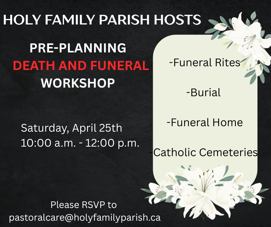 Holy Family - St. Albert 75 Poirier Avenue, St. Albert, Alberta, CanadaPRE-PLANNING DEATH AND FUNERAL WORKSHOP Date: April 25th Time: 10 a.m.-12 noon Contact information: Please RSVP to pastoralcare@holyfamilyparish.ca