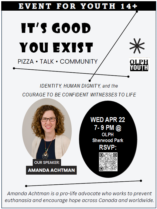 Presenter: Amanda Achtman 6:15 pm Mass celebrated by Archbishop Stephen Hero 7:00 pm Presentation Many people think that there are circumstances under which it is reasonable for someone to ask someone else to end their life. In the jurisdictions where euthanasia is legal, there has tended to be an increase in the number of people opting for it. Some of the reasons listed in government reports are due to cancer, chronic illness, or disability. Does life lose its sense in the face of suffering? Or, is life always worth living? Come get inspired to encounter, understand, and overcome the euthanasia temptation. Filled with stories, this talk will equip you to better engage in these conversations and experiences in your own life because this concerns all of us. No cost. No registration required. Everyone welcome! April 21, 7-9 pm Our Lady of Perpetual Help Parish 13 Brower Drive, Sherwood Park