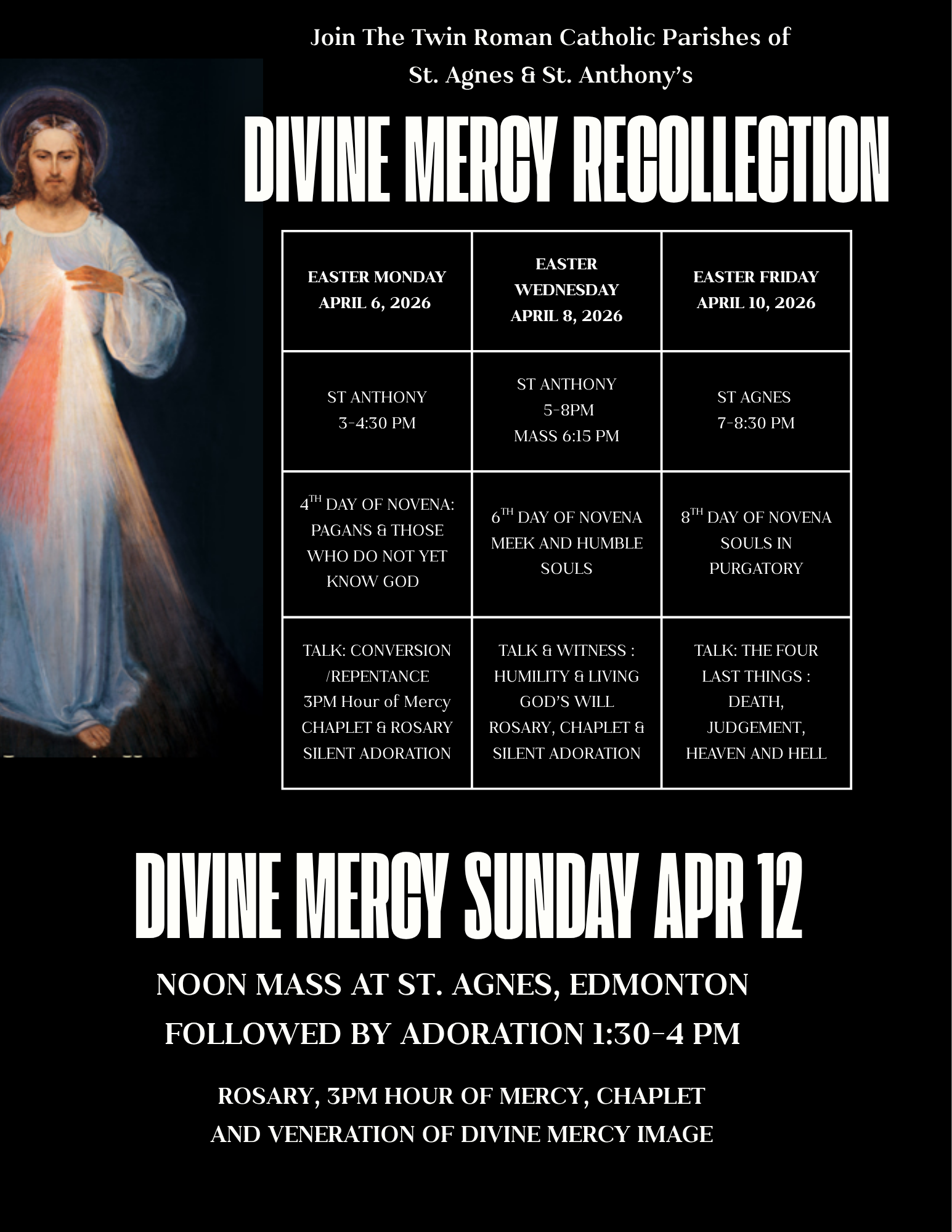 St. Anthony Parish 10661 Whyte (82) Avenue NW, Edmonton, AB, CanadaFeast of Divine Mercy: A Time of Unfathomable Grace Join the Twin Parishes of St. Agnes and St. Anthony as we prepare for Divine Mercy Sunday, a Solemnity established by St. John Paul II to celebrate the message of mercy revealed to St. Faustina. Throughout Easter week, we will host special evenings of recollection, featuring talks and prayers during Adoration. Please see the poster for a detailed format of the evenings and celebrations. Easter Wednesday, April 8: 5:00 pm – 8:00 pm at St. Anthony Church (Mass 6:15-7 PM) Easter Friday, April 10: 7:00 pm – 8:30 pm at St. Agnes Church Divine Mercy Celebration: Sunday, April 12 at St. Agnes Church 12 PM: Mass 1:30-4 PM: Adoration, 3PM Hour of Mercy, Chaplet, Veneration of Divine Mercy Image For more information, please contact the parish office The Twin Roman Catholic Parishes of St. Agnes & St. Anthony twinparishes.caedm.ca Phone (780) 432-0611 Email: stanthony.edm@caedm.ca St Agnes Church: 10826 – 62 Avenue, Edmonton, Alberta, T6H 1N1 St Anthony Church: 10661 – 82 Avenue, Edmonton, Alberta, T6E 2A6