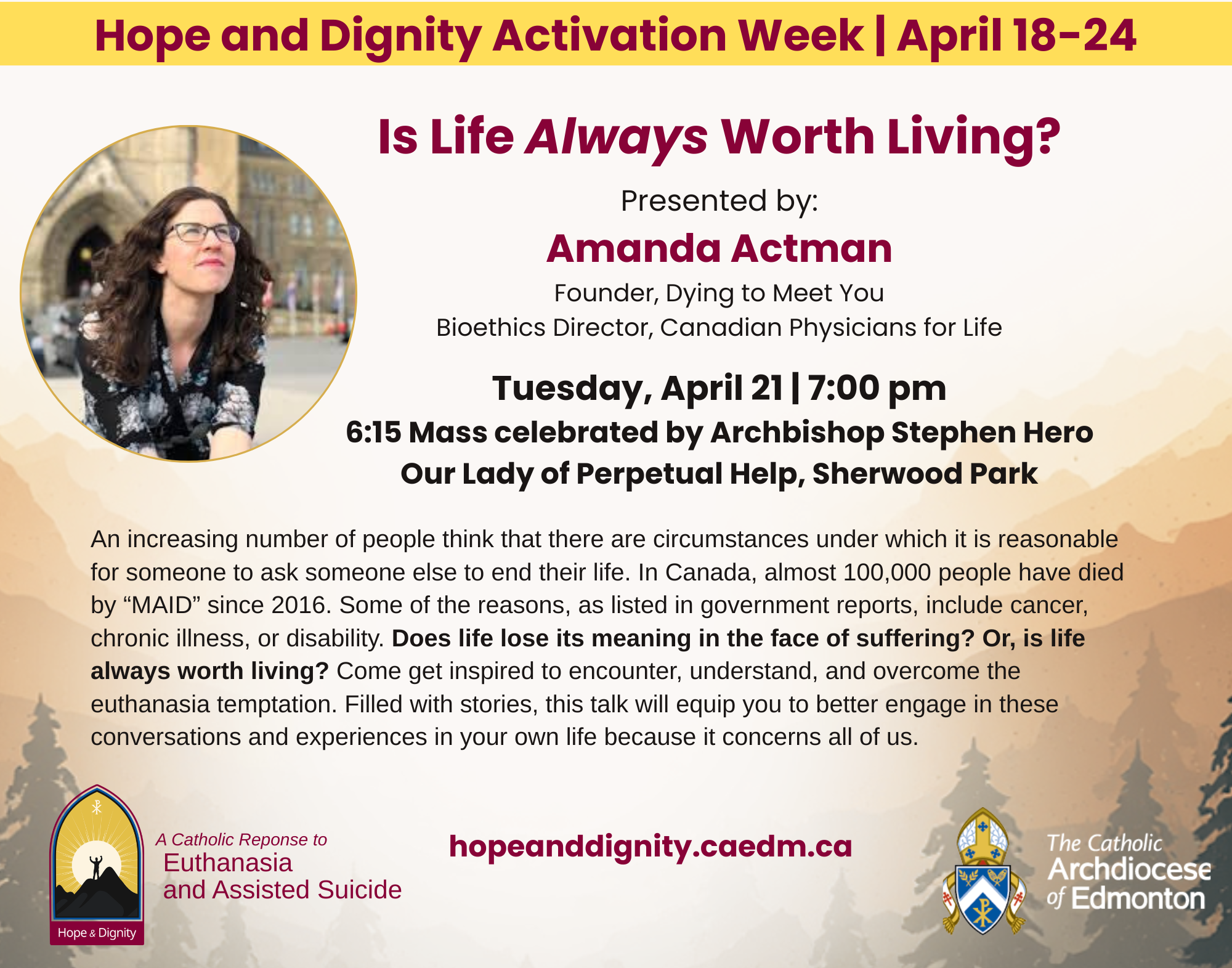 Our Lady of Perpetual Help, Sh Pk 13 Brower Dr, Sherwood Park, Alberta, CanadaPresenter: Amanda Achtman 6:15 pm Mass celebrated by Archbishop Stephen Hero 7:00 pm Presentation Many people think that there are circumstances under which it is reasonable for someone to ask someone else to end their life. In the jurisdictions where euthanasia is legal, there has tended to be an increase in the number of people opting for it. Some of the reasons listed in government reports are due to cancer, chronic illness, or disability. Does life lose its sense in the face of suffering? Or, is life always worth living? Come get inspired to encounter, understand, and overcome the euthanasia temptation. Filled with stories, this talk will equip you to better engage in these conversations and experiences in your own life because this concerns all of us. No cost. No registration required. Everyone welcome! April 21, 7-9 pm Our Lady of Perpetual Help Parish 13 Brower Drive, Sherwood Park