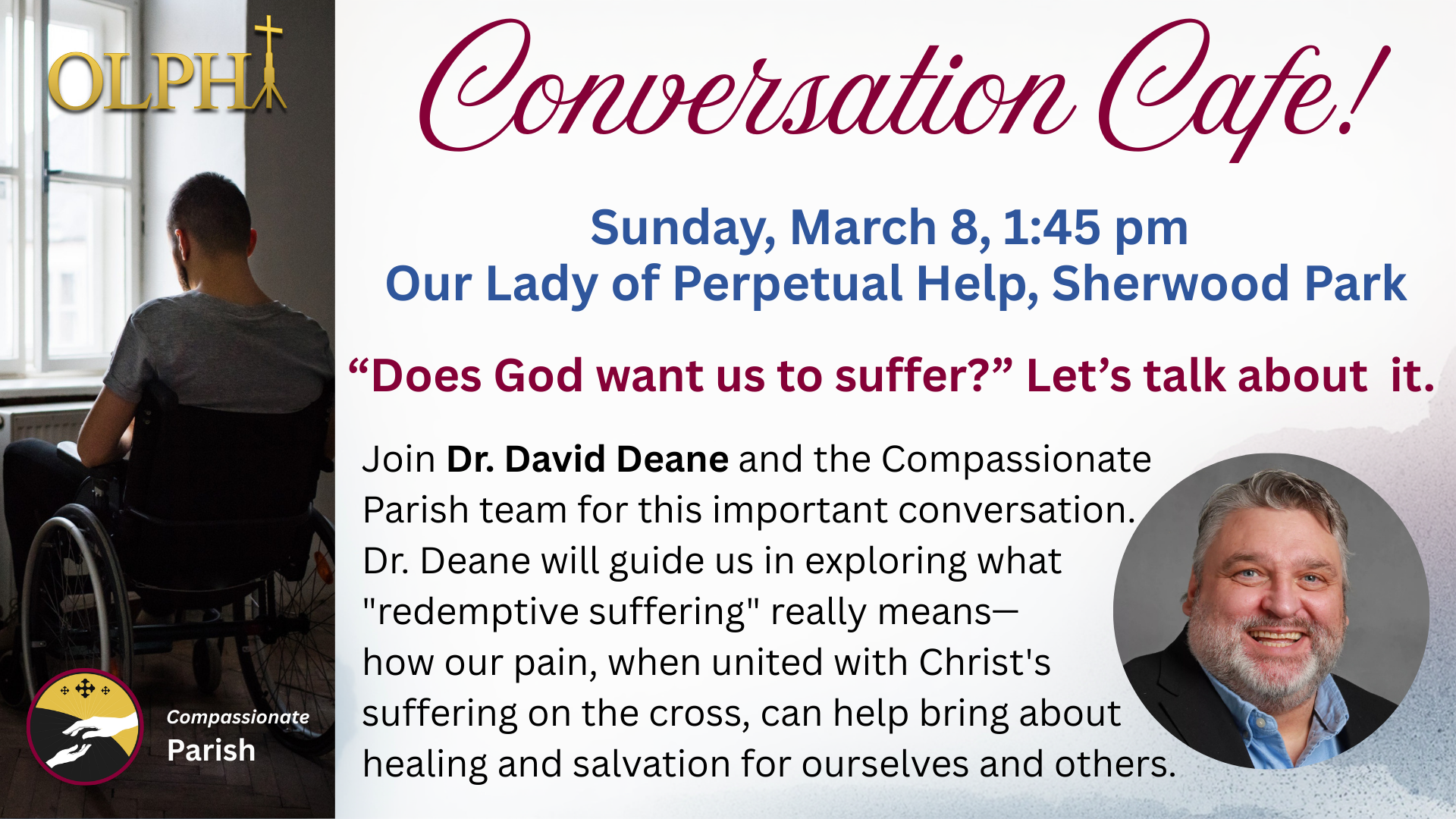 Our Lady of Perpetual Help, Sh Pk 13 Brower Dr, Sherwood Park, Alberta, CanadaDoes God want us to suffer? Let's talk about it. Join Dr. David Deane, Newman Theological College's newest professor, for this important conversation. Dr. Deane will guide us in exploring what "redemptive suffering" really means - how our pain, when united with Christ's suffering on the cross, can help bring about healing and salvation for ourselves and others. For more info contact Margo at laberge2@telus.net