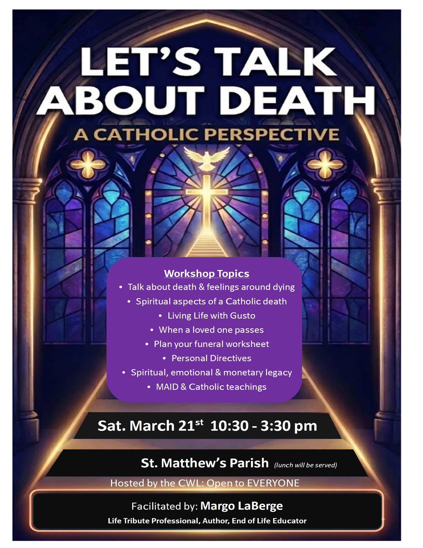 Hosted by the CWL: Open to EVERYONE Workshop Topics: Talk about death & feelings around dying Spiritual aspects of a Catholic death Living Life with Gusto When a loved one passes Plan your funeral worksheet Personal Directives Spiritual, emotional & monetary legacy MAID & Catholic teachings Sat. March 21st 10:30 - 3:30 pm St. Matthew’s Parish (Rocky Mountain House) Lunch will be served Facilitated by: Margo LaBerge, Life Tribute Professional, Author, End of Life Educator