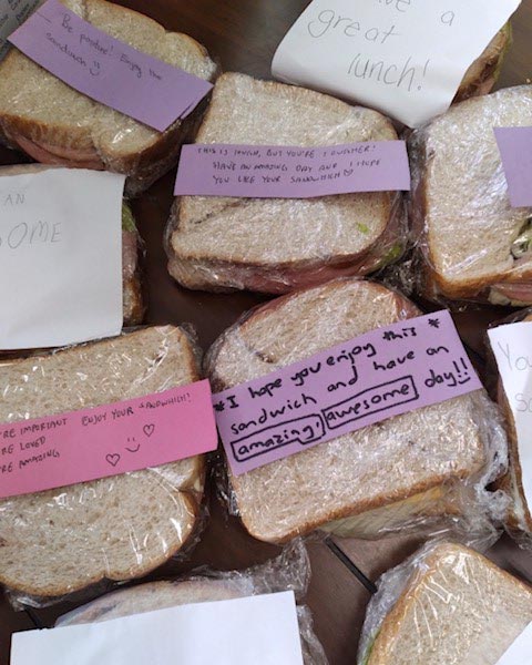 Students added a handwritten note to each sandwich to show respect and solidarity with those who come to the parish for help. Those notes have put smiles, and tears, on many faces. It’s a beautiful example of kids learning that they can build a better community by small acts of kindness.