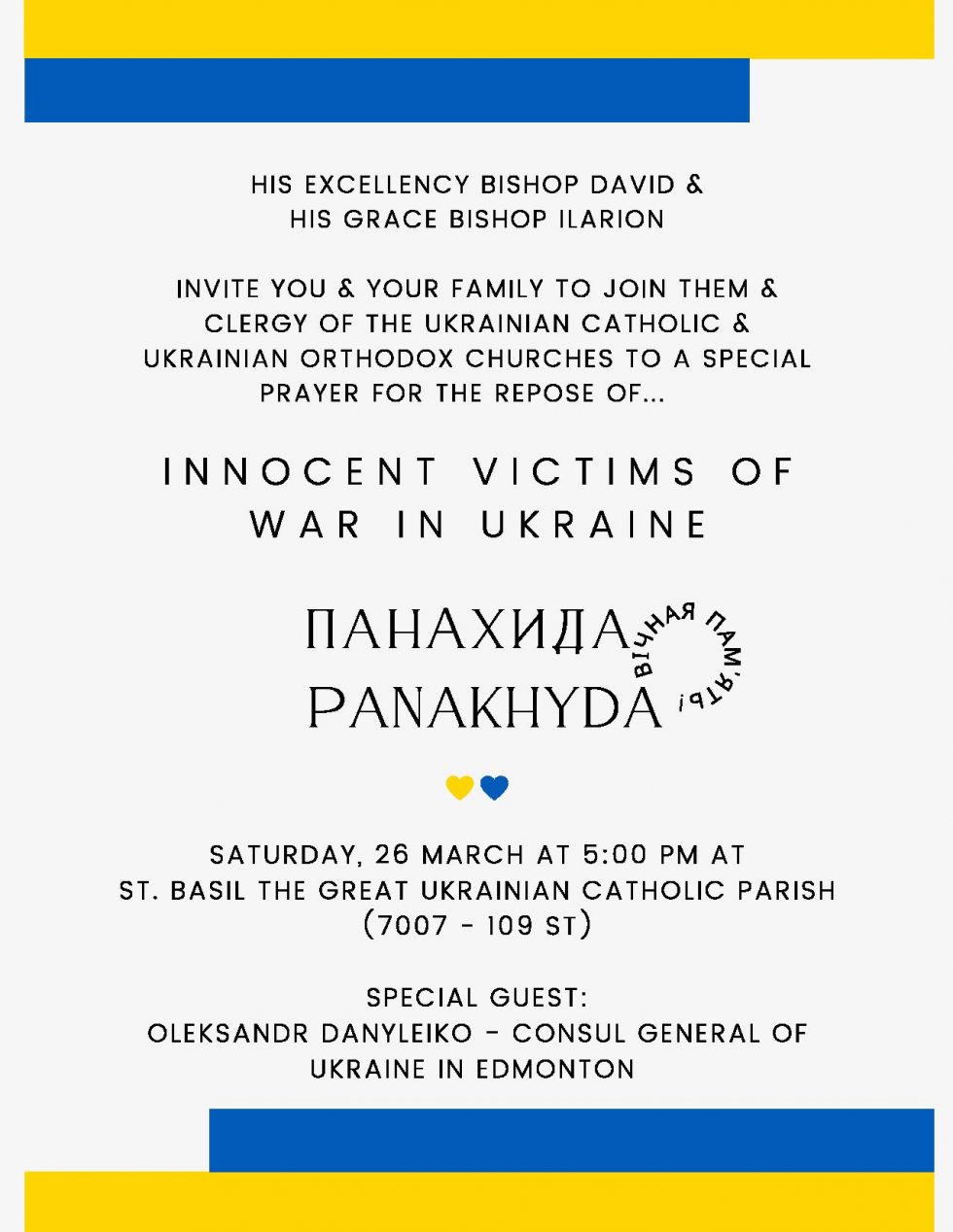 Join us in prayer for the innocent victims of war in Ukraine through the offering of a Panachyda (Ukrainian sung memorial prayer) on Saturday, March 26, at 5 pm at Saint Basil Parish, 7007 - 109 Street, Edmonton.