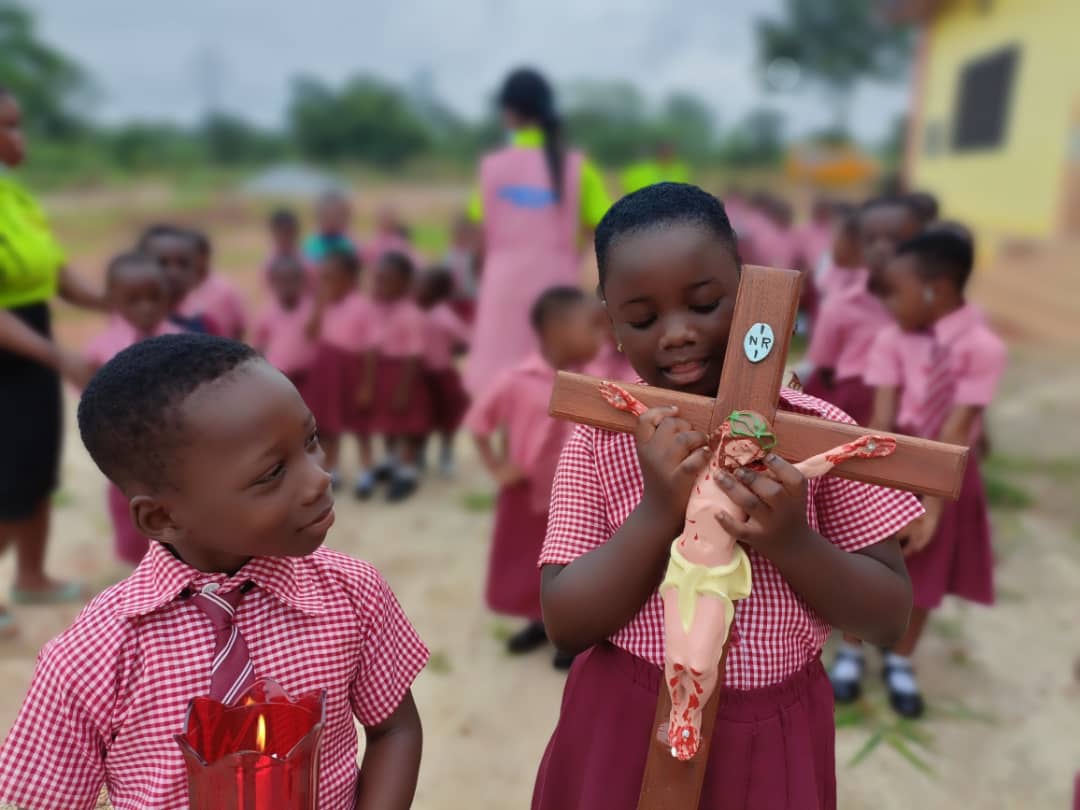 Students carry a crucifix at CMI Marriet Kwamang School in Ghana