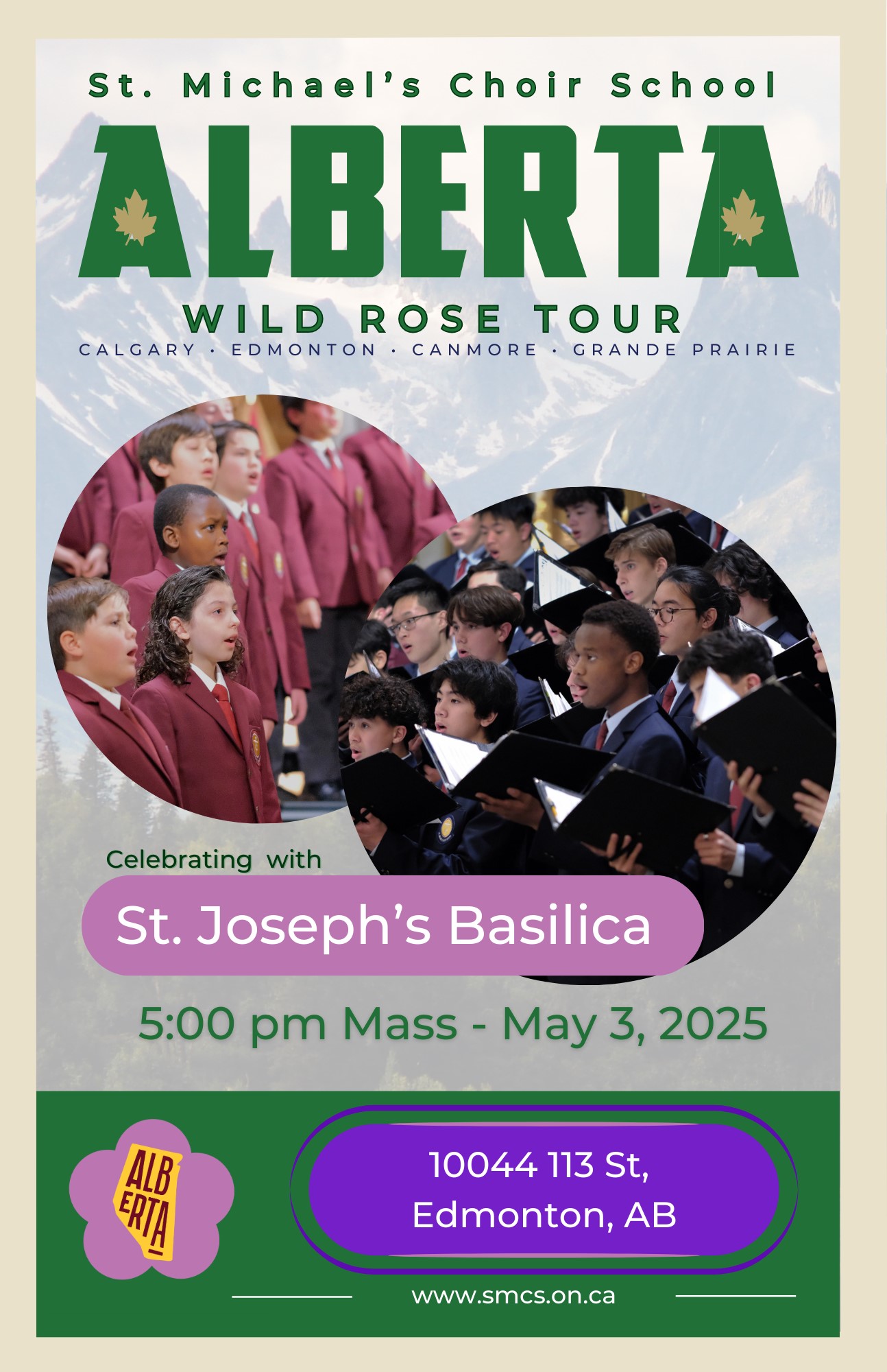 St. Michael’s Choir School (SMCS), one of Canada’s most distinguished choral institutions, will join the parish community of St. Joseph’s Basilica in Edmonton for the celebration of the 5 p.m. Mass on Saturday, May 3, 2025. The boys of SMCS will lend their voices to the liturgy, offering a rich and prayerful musical contribution to this special Eucharistic celebration.