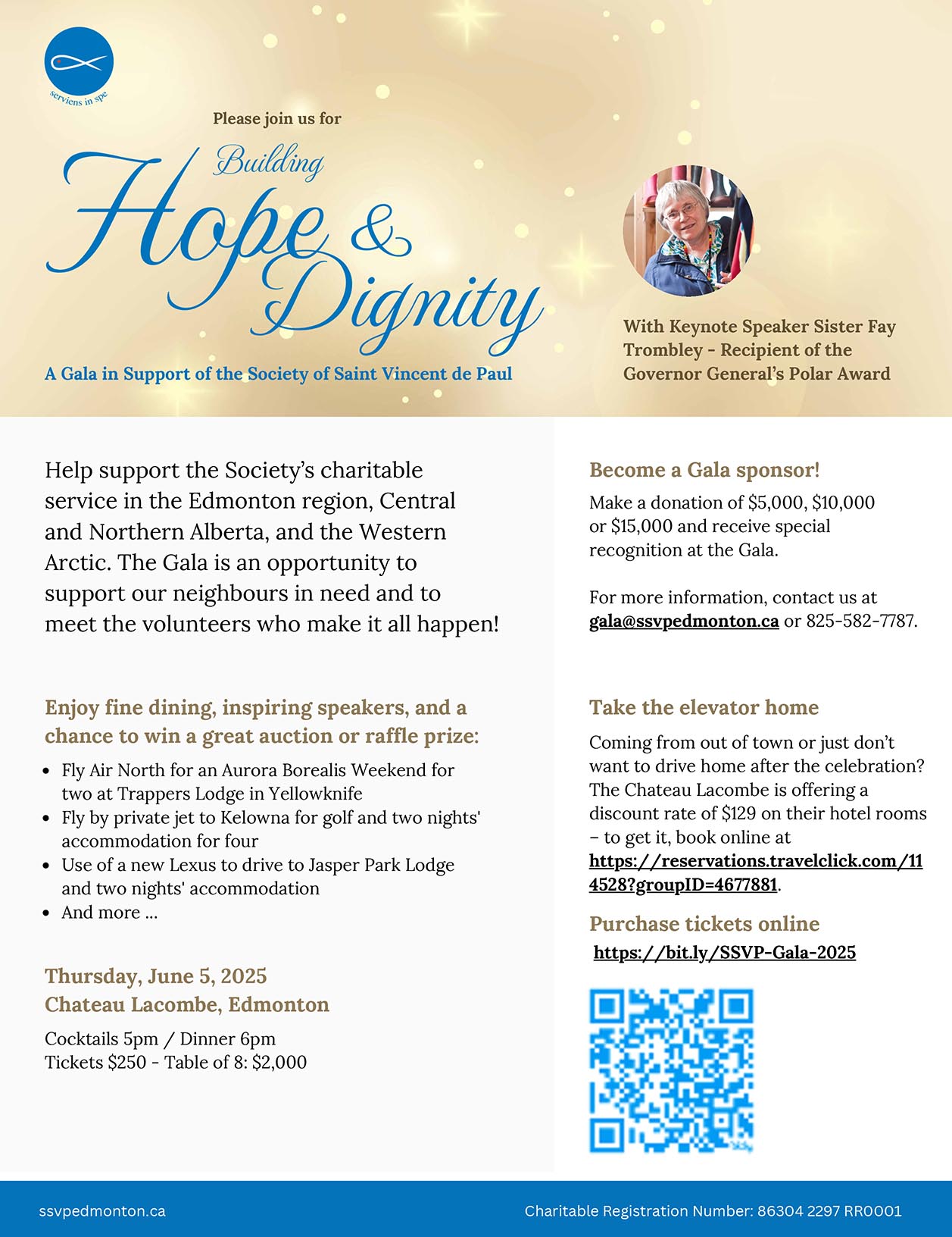 For more information contact SSVP at gala@ssvpedmonton.ca or 825-582-SSVP (7787).