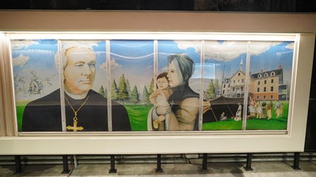 Francophonie Jeunesse de l’Alberta (FJA) board commissioned a mural in 1989 which depicts Bishop Grandin, and a nun holding an Indigenous baby. FJA said the mural was designed to honour Monseigneur Grandin for his contributions to Francophone culture, language, and religion. The 3-part mural also features images of St. Joachim Church, St. Joseph’s Cathedral Basilica, and Grandin Elementary School.